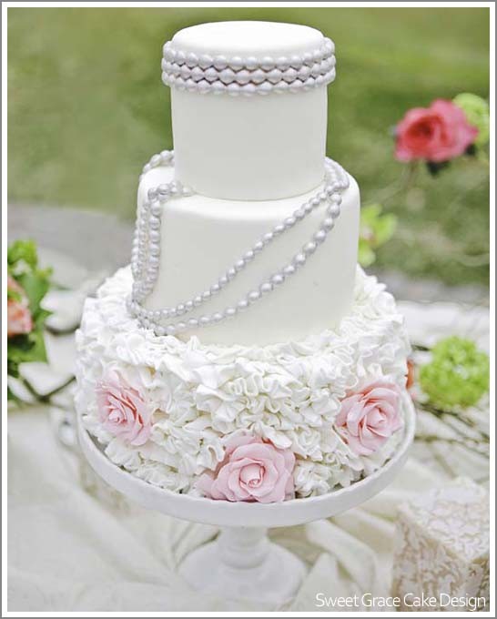 The Décor- There are so many trendy ideas and ways to decorate your wedding cake that it could actually upstage the wedding dress. Some people are into the cupcake trend, others like a traditional tier cake. The choice is yours depending on your style and your budget. When choosing a wedding cake, be sure that you have the color theme and the shape that you like. Not certain? Consider adding pearls to your décor, the look of pearls are very classy and elegant. Your guests will be amazed! Take a look at these pearly cakes.